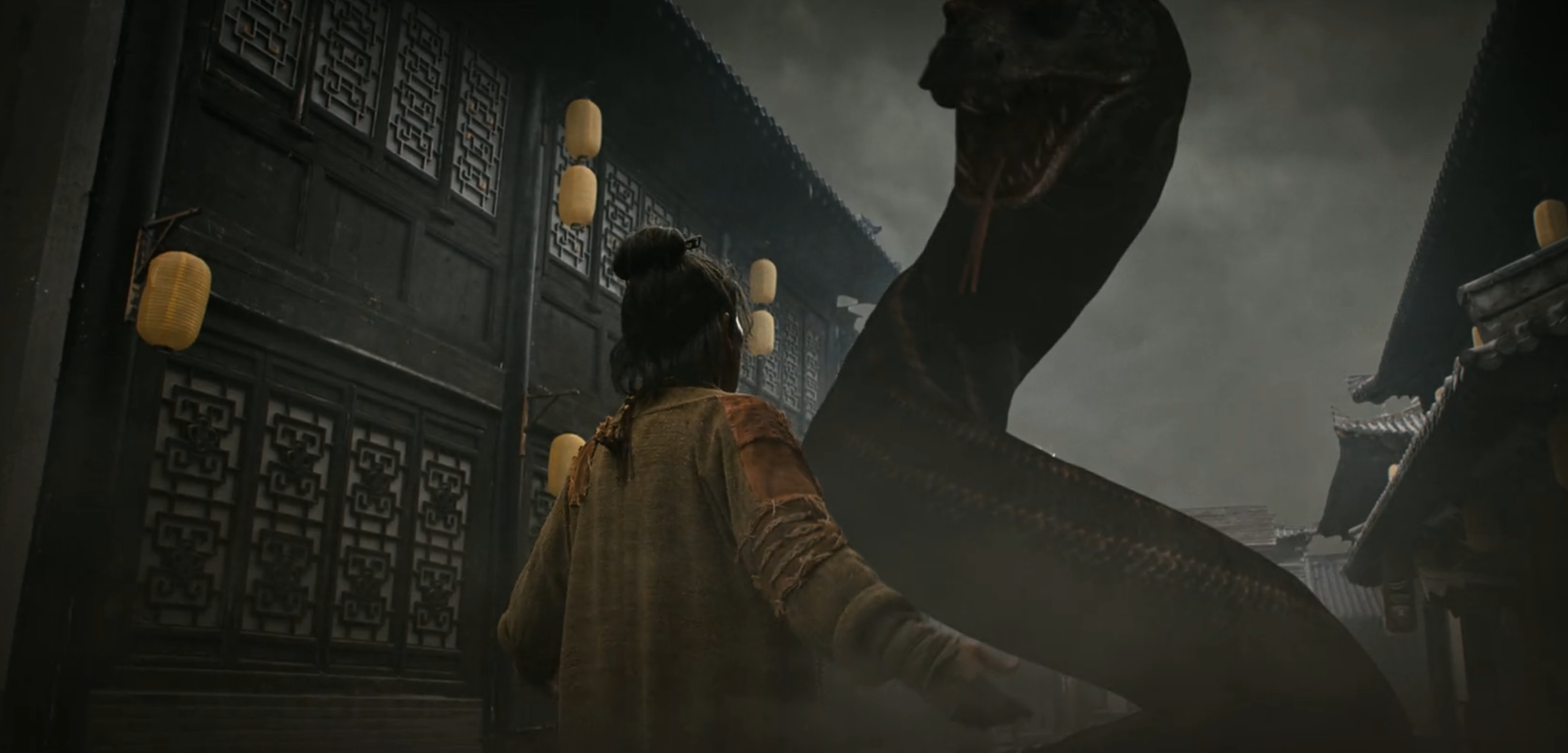 僵尸又化成一條巨蛇,背著紅衣女子消失在漫漫黑夜中