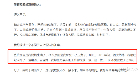 等她回歸歌壇的時候,變化早已翻天覆地。人氣一蹶不振的吳莫愁,一度淪落到縣城賣唱。