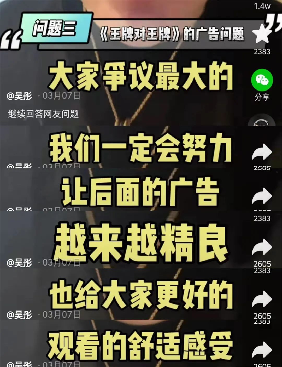 比如隨時在線收集問題,吳彤承認了廣告處理得不好,后續節目已經做出調整了。