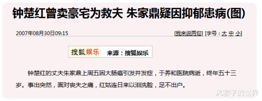 但是好景不長,兩人的幸福只維持了16年,2007年,朱家鼎因大腸癌去世,丈夫的去世對鐘楚紅的打擊非常大。