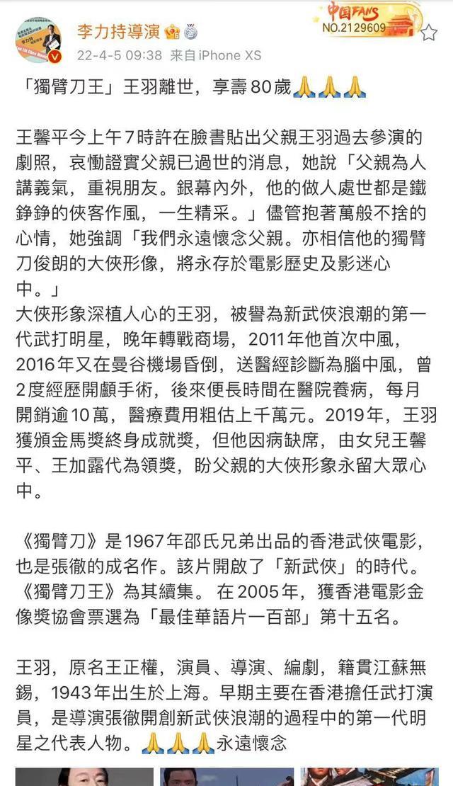 李力持導演看來還是了解王羽先生,畢竟都是導演圈的,他更多介紹王羽先生的生平和成就。成龍甄子丹等可能都會發文悼念,他去世的消息才出來,大家還有一個接受的過程。