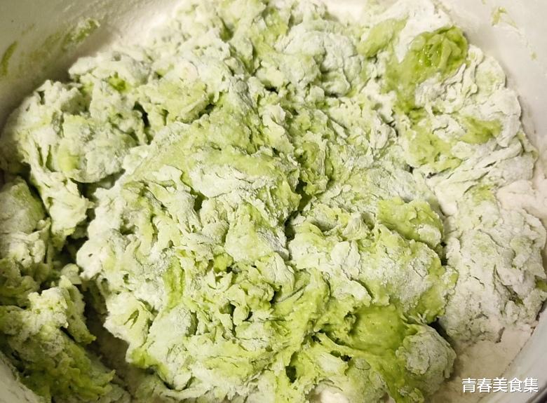 取一半面粉發,用菠菜汁,邊倒邊攪拌成絮狀。并和成面團。