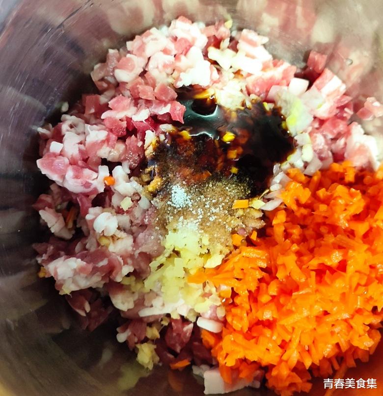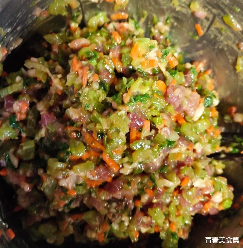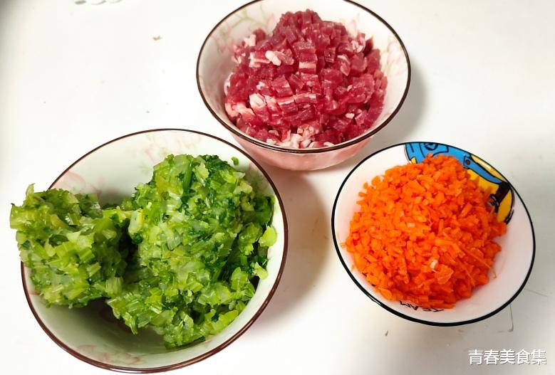 五花肉切碎,芹菜清洗干凈后,下熱水鍋焯一下后切碎,芹菜不要切得太碎,那樣吃起來沒有芹菜味,胡蘿卜洗凈去皮后擦成絲后也切成碎。