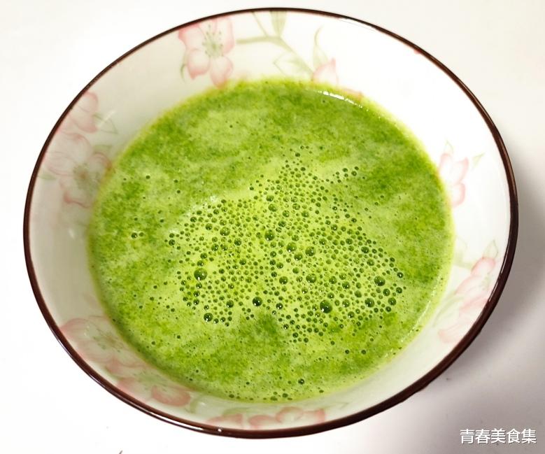 取一顆菠菜,清洗干凈后,切成段,放入破壁機里,加入60ml水,打碎成汁液。