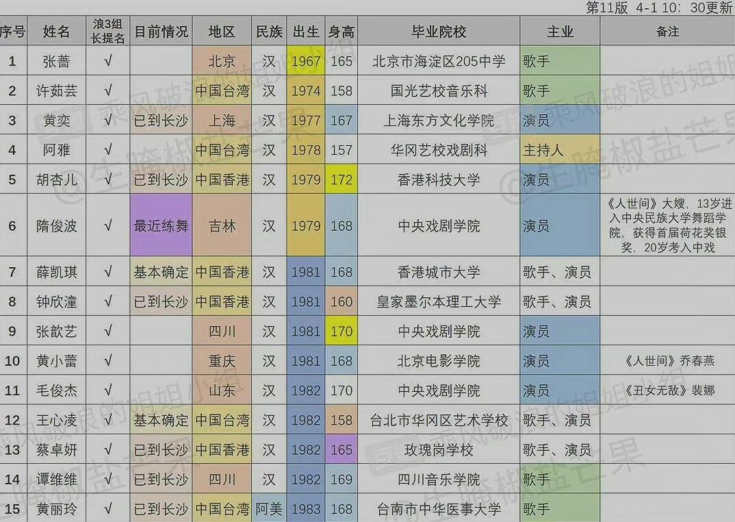 這份名單比較長,上面那張圖只是其中一部分而已。在網傳的表格里,還有張薔、黃奕、胡杏兒、阿雅、鐘欣潼、王心凌、蔡卓妍等等,都出現在了名單上。并且,她們的名字都被打了勾,看起來參加《浪姐3》的可能性是比較大的。