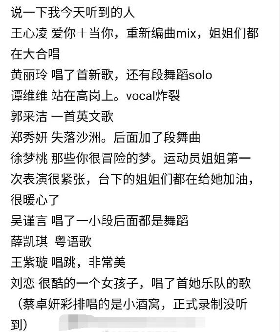在分組的時候,隊長有六個,剩下的姐姐會自由組隊,至于人數限制的話,沒有明確規定。之前也有人爆料,這一次的公演里,節目組不會提供歌單,而是讓各小組的姐姐自己選擇,這就有看點了。