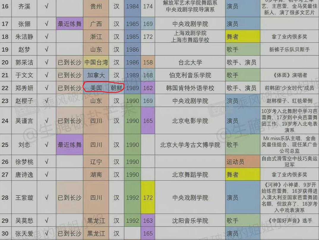 在之前網傳的參賽名單里,可以看到很多熟悉的名字,而張儷、于文文、吳謹言、劉戀、徐夢濤、王紫璇、吳莫愁等等,都跟之前的爆料對上了。而在民族這一欄里,我們可以看到,鄭秀文的國籍是“美國”,而民族則被標記為“朝鮮族”。