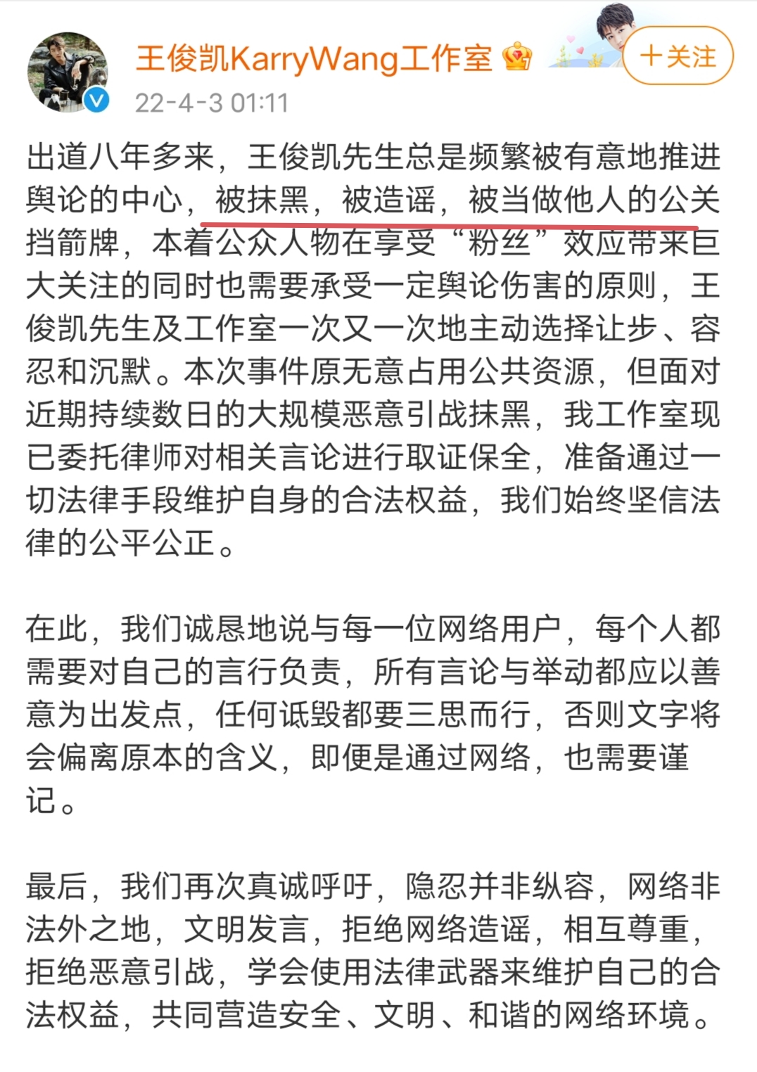 沒想到這件事還牽扯到易烊千璽的好兄弟王俊凱,王俊凱的工作室也發出維權聲明,表示總是被抹黑,被造謠,被當作別人的公關擋箭牌,不再忍受,將通過法律手段維護權益。