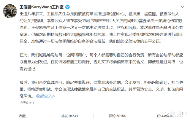 最后,王俊凱工作室呼吁大家要文明發(fā)言,不要造謠生事,更不要惡意引戰(zhàn),要學會用法律武器維護自己的合法權(quán)益,共同營造文明和諧的網(wǎng)絡(luò)環(huán)境。