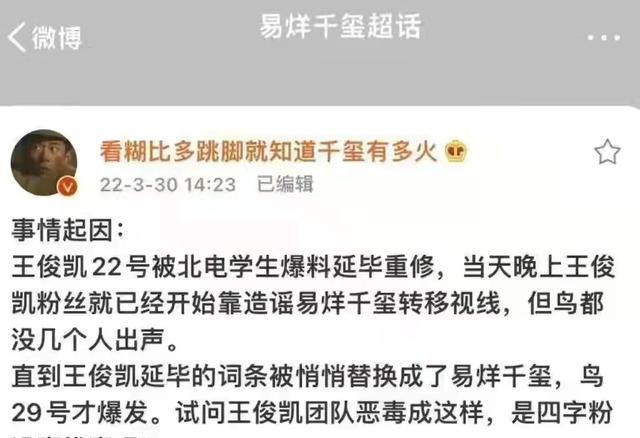 這次是因為【延畢】的事情,王俊凱的粉絲和易烊千璽的粉絲都已經撕開了。