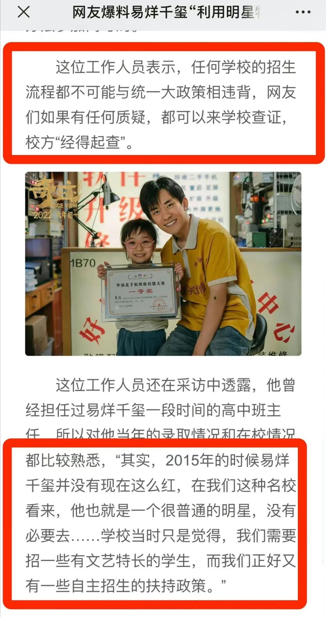 當然了,要是說有問題,錄取四字易烊千璽的這個所謂的名校,肯定是有一定的問題的,畢竟作為一個公立的高中,專門為了一個學生去開一次,一對一的家長會,委實于情于理也不妥呀,難道就因為這個學生是“明星”嗎?