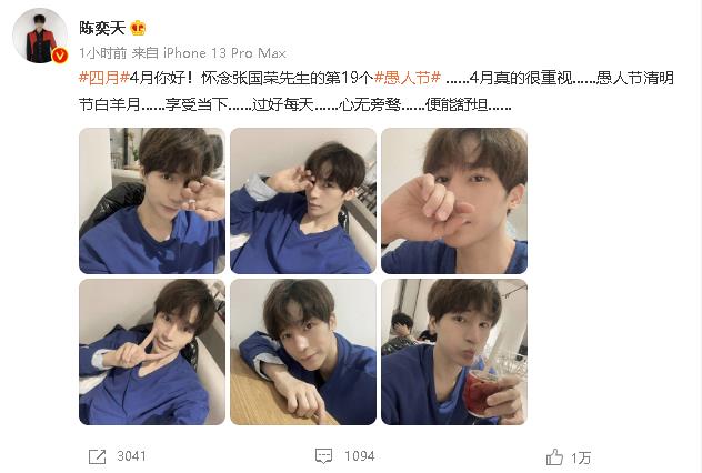 陳奕天選擇在今天發動態“#四月#4月你好!懷念張國榮先生的第19個#愚人節#,4月真的很重視,愚人節清明節白羊月,享受當下,過好每天,心無旁騖,便能舒坦。”配上了自拍圖。
