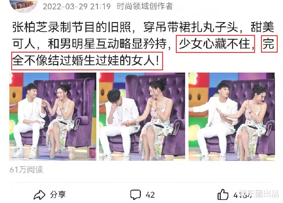 3月29日,有一位時尚博主在網上分享了一篇關于張柏芝穿吊帶裙錄制節目的帖子,曬出了一組張柏芝穿吊帶裙錄制節目的舊照,并表示“張柏芝錄制節目的舊照,穿吊帶裙扎丸子頭,甜美可人,和男明星互動略顯矜持,少女心藏不住,完全不像結過婚生過娃的女人!”,這一組張柏芝穿吊帶裙錄制節目的舊照火了,張柏芝和男明星互動時的表現成為了網友們關注和熱議的焦點。