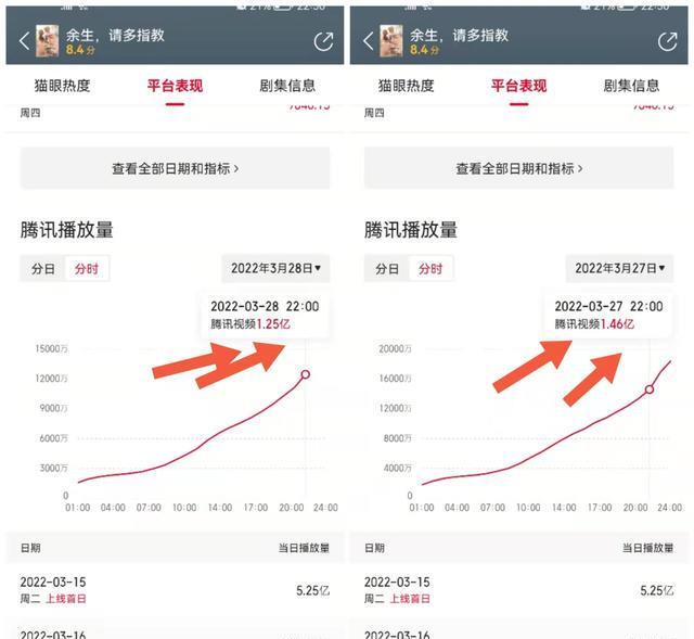 網絡播放量方面,前一天總播放量拿到了1.85億,然而第14天橫向對比同一時間少了2000多萬。看來周末對于《余生請多指教》的加成不小,只可惜單日破2億播放量的夢想可能要成為遺憾了。