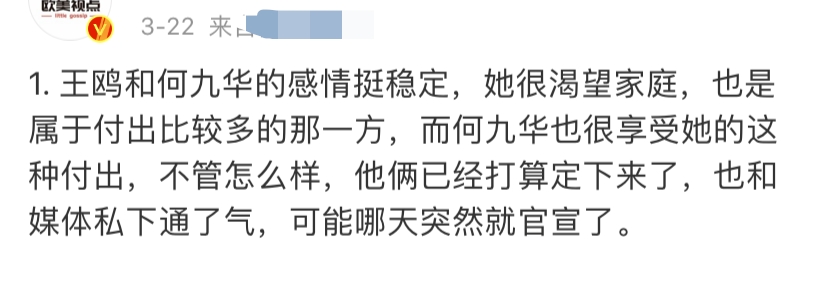 有博主透露,王鷗和何九華的感情很穩定,目前王鷗付出比較多,因為她比較渴望家庭,而對方也很習慣她的付出,并打算定下來了,隨時可能會官宣。