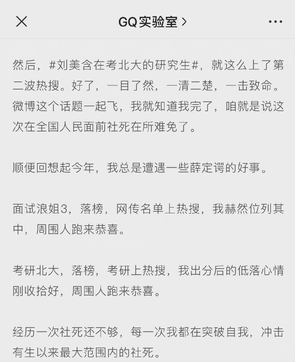 就在所有人都在為她慶祝時,事實并不是如此。從研究生話題上了熱搜后,劉美含才自曝考研北大落選。看到分數后的劉美含心情十分低落卻還要向大家澄清這社死的場面??上攵獔雒嬗卸鄬擂?。