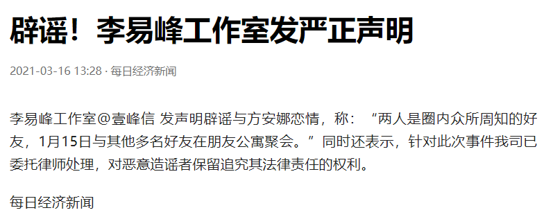 消息在3月15日剛曝出不久,李易峰的工作人員就出來官方辟謠。表示沒什么不方便回應(yīng)的,這些狗仔都是捕風(fēng)捉影。隨后,又覺得這樣不能自證李易峰清白,又坦言到1月被拍攝到的畫面,是一起去朋友家里聚餐,并無其他事情。