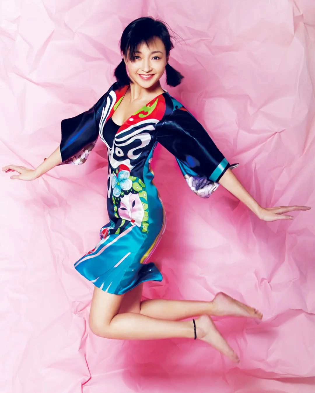 扎起兩個小辮子,露出一張笑靨如花的臉蛋;修身包臀裙,絲質面料,鮮艷染色,與她的笑容,特別相得益彰。