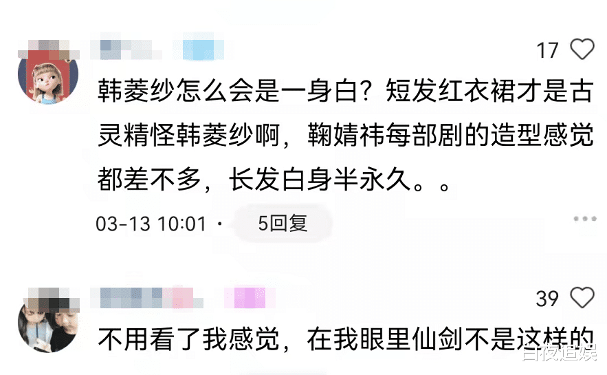 有網友表示:“韓菱紗怎么會是一身白色?短發紅裙才是古靈精怪的韓菱紗呀,鞠婧祎的每部劇的造型都差不多,長發白衣半永久”。