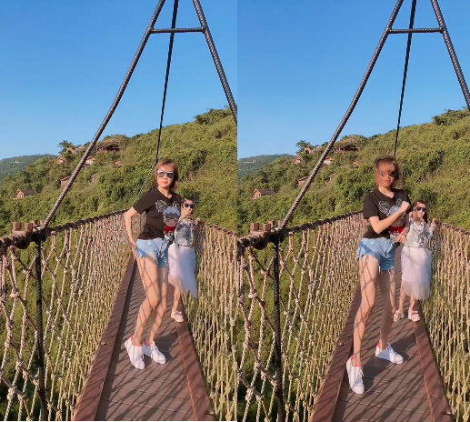 近日,演員金巧巧在社交平臺曬出一段跳舞的視頻。視頻中的金巧巧和女兒站在吊橋上,橋旁邊都是用繩索固定。金巧巧站在橋上,靈活地舞動著自己的雙手,穿著短褲露出細白的大長腿,十分惹人注目。女兒站在身后用手把著扶手,看起來有點害怕。