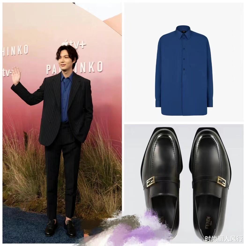 我們可以看一下李敏鎬的這身西裝配色,整身的藏藍色調和腳下的黑色皮鞋搭配,首先在整體的配色上,就做到了視覺上的統(tǒng)一感,而在細節(jié)的配色中,內搭的襯衣選擇了偏淺色調的藍色,搭配整身的藏藍色,既做到了色調的統(tǒng)一感,也凸顯了配色的深淺變化效果,在視覺上就更好的起到了增加造型亮眼的感覺了。