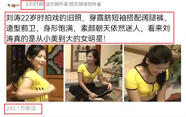 3月17日,有一位娛樂博主在網上曬出了一組劉濤22歲時拍戲的舊照,并配文“劉濤22歲時拍戲的舊照,穿露臍短袖搭配闊腿褲,造型前衛,身形飽滿,素顏朝天依然迷人,看來劉濤真的是從小美到大的女明星!”該娛樂博主的言論引起了網友們的關注,短短3個小時,閱讀量就超過了283萬,從這一點就能看出劉濤的拍戲舊照有多么受歡迎了。