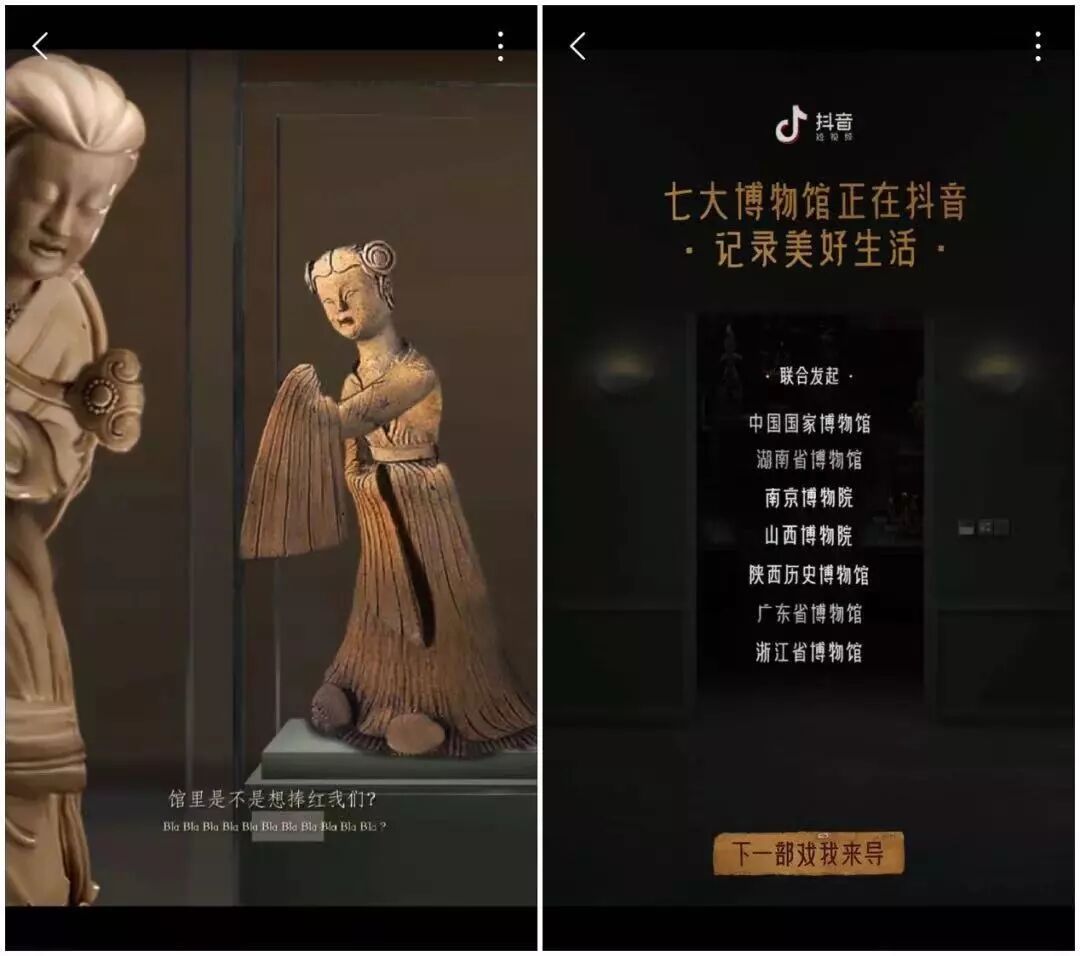 原本靜默在展臺上“肅穆而立”的國寶文物們,在視頻中配合著抖音旋律翩翩起舞,以更加年輕化、病毒式的方式,讓更多年輕人加深了對這些文化瑰寶的關(guān)注和認知。