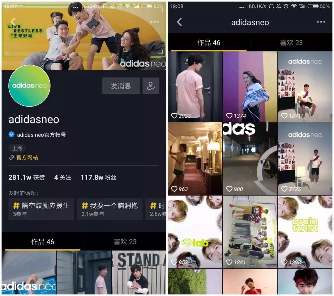 就在今年1月,阿迪達斯旗下面向年輕人的品牌adidas neo入駐抖音,并在3月正式與抖音官方合作,在短短1個多月內(nèi),積累起超百萬的粉絲,視頻總播放量1.5億,獲得280萬互動(關(guān)注+點贊+評論)。