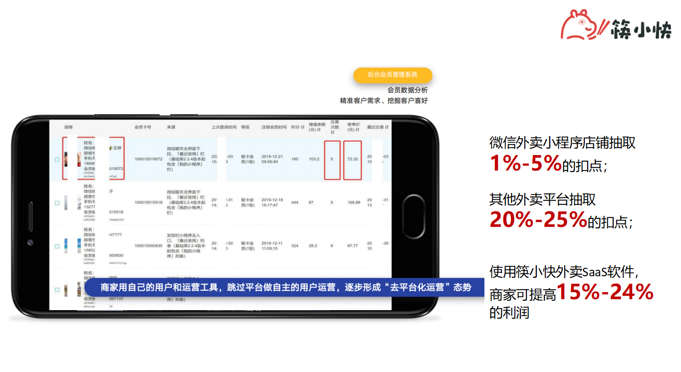 簡單來說,餐飲商家可以自己運營獲取的流量,不再依附于外賣平臺。而不懂運營的商家還可以選擇代運營服務。至于商家關心的傭金,微信外賣小程序店鋪抽取比例大約1%-5%之間,相較于大平臺20%-25%的傭金比例,接入筷小快外賣SaaS系統,可提高至少15%的利潤。