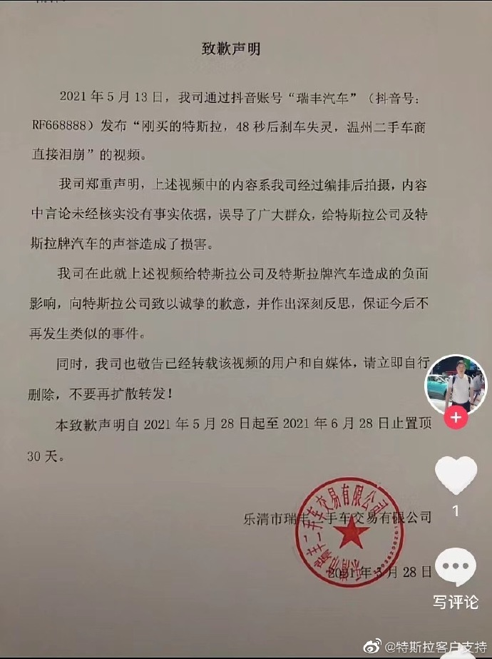 在本次公布的6則致歉聲明分別來自***“瑞豐汽車”、自媒體賬號“60秒懂車”、微博賬號“類星頻道”、“五商文化”、“鳴金網”、微博賬號“Teikeni數碼君”。其中,瑞豐汽車發布的“剛買的特斯拉,48秒后剎車失靈,溫州二手車商直接淚崩”視頻內容因為言論未經核實沒有事實依據,誤導了廣大群眾,致歉聲明將會置頂30天。