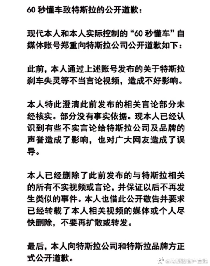 60秒懂車同樣是發布了關于特斯拉剎車失靈等不當言論視頻,造成不好影響。目前,相關內容已經刪除,作者本人保證以后不再發生類似事件。60秒懂車也借此公開警告并要求已經轉載了相關視頻的媒體或個人盡快刪除,不要再擴散或轉發。