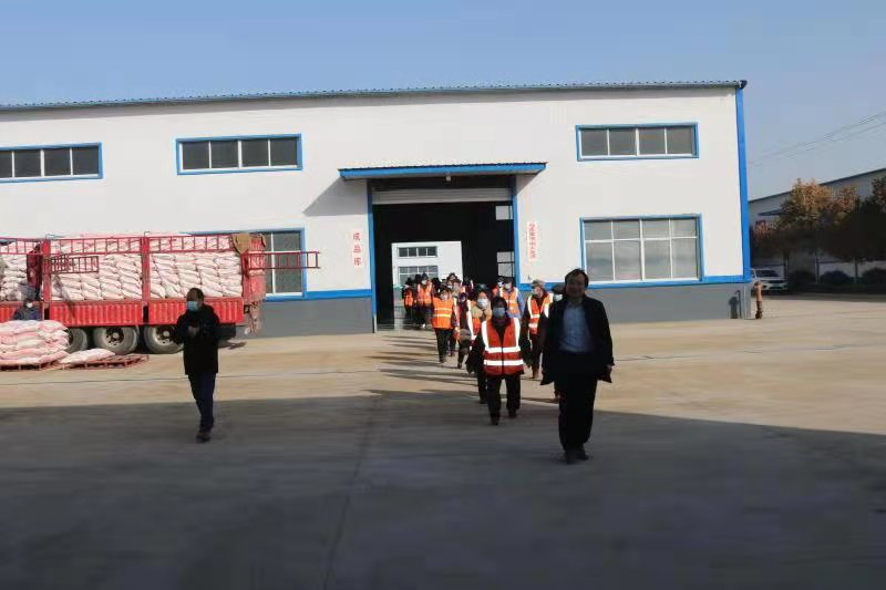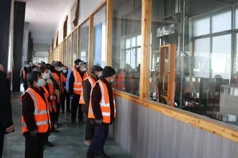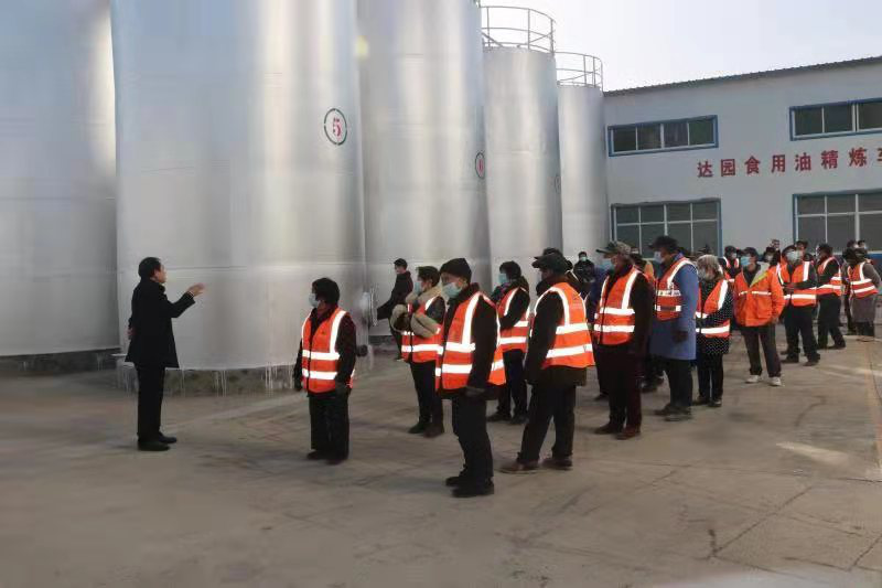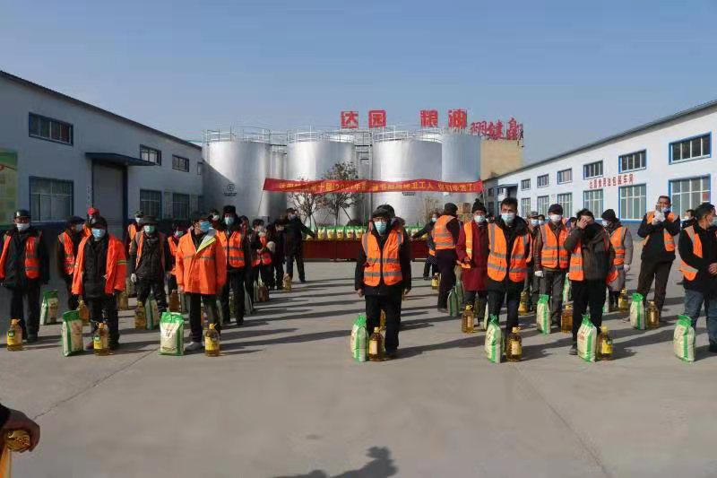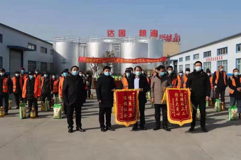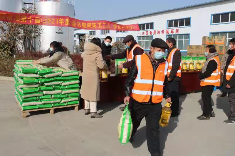 流程:先致詞歡迎環衛工人,觀摩達園廠區生產車間,發放慰問福利大米和食用油,合影留念