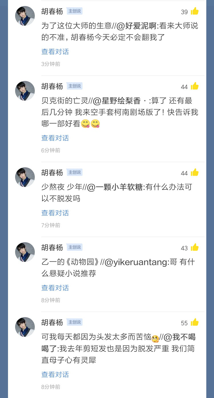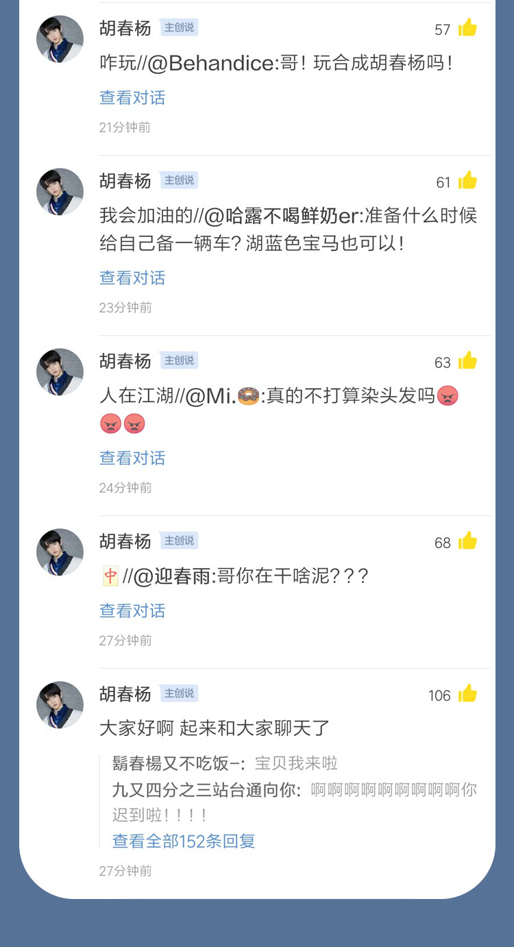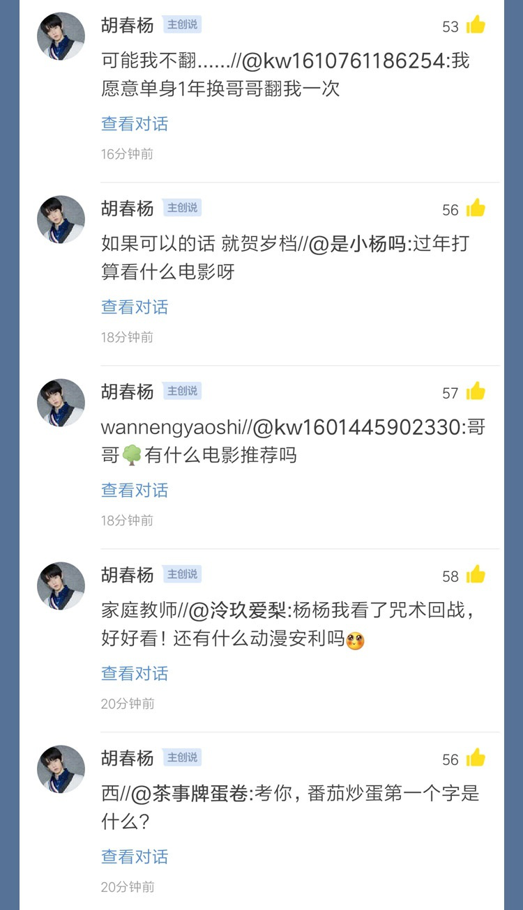 作為偶像,胡春楊覺得和粉絲的關系是“互相作用,共同成就”,“距離感是要有的,然后互相有回應,彼此愛,彼此關心對方”,他希望能和粉絲們一起進步,互相鼓勵,成為更好的自己。在節目中,共有兩名幸運粉絲的來信被胡春楊翻牌。對于粉絲來信中談到對于舞臺和演戲的平衡,他也透露了自己的想法和計劃,堅定表示“都不會放棄”,如果有機會,他一定會好好把握機會,繼續為大眾和粉絲帶來好的作品。