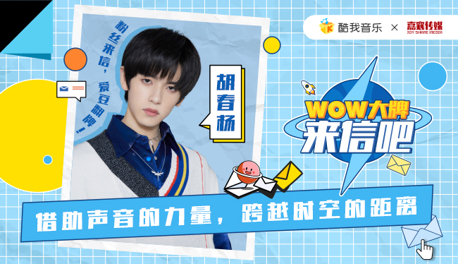 ?2021年伊始,新生代藝人胡春楊攜新單曲做客《WOW大牌來信吧》,開啟一場與粉絲跨越時空的對談。《WOW大牌來信吧》是由騰訊音樂娛樂集團(TME)旗下酷我音樂、酷我暢聽與嘉襄傳媒聯合出品的國內首檔藝人與粉絲對話的音頻節目。以“信”為載體,通過嘉賓讀信與回信的方式,進行藝人與粉絲的隔空交流。