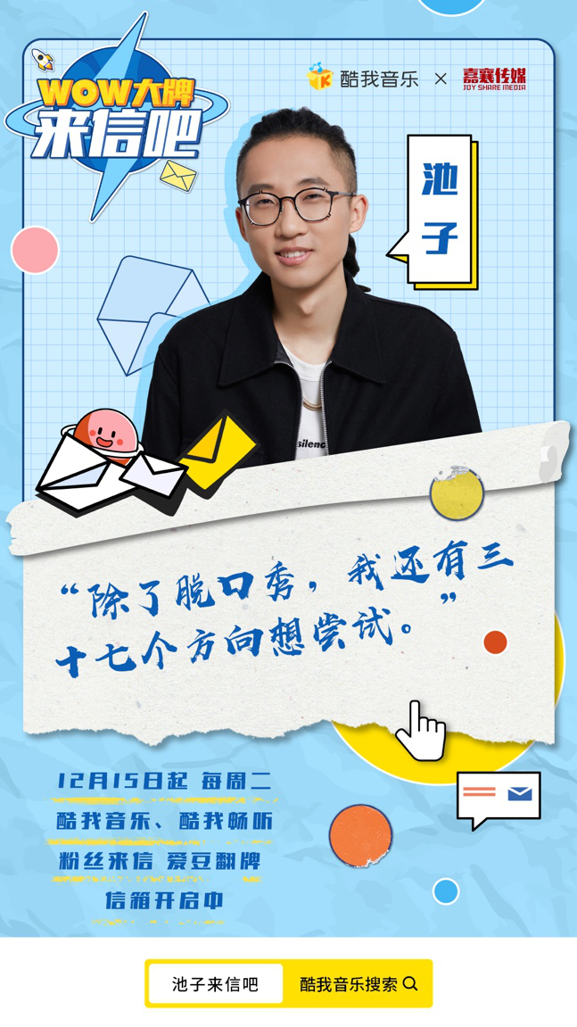 ?2021跨年之際,著名脫口秀演員池子做客《WOW大牌來信吧》,真誠開啟與粉絲的隔空對談。《WOW大牌來信吧》是由騰訊音樂娛樂集團(tuán)(TME)旗下酷我音樂、酷我暢聽與嘉襄傳媒聯(lián)合出品的國內(nèi)首檔藝人與粉絲對話的音頻節(jié)目。以“信”為載體,通過嘉賓讀信與回信的方式,進(jìn)行藝人與粉絲的隔空交流。