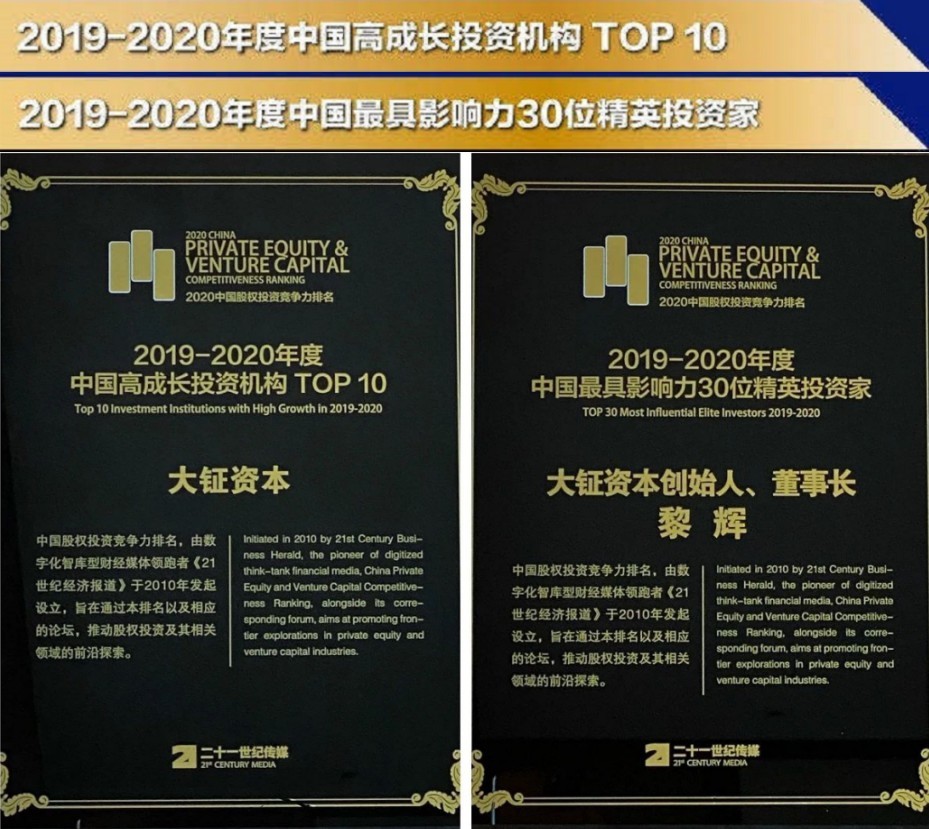 大鉦資本名列2019-2020年度中國高成長投資機構Top 10,大鉦資本董事長黎輝先生被評為2019-2020年度中國最具影響力30位精英投資家之一。