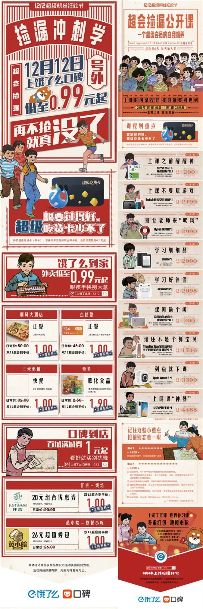 然后,整個清單以上課的形式展現,主要分為“上課之前醒醒神”“上課不要玩游戲”“別讓老師來吹風”等,每堂課對應一個產品福利信息。同時還制作了撿漏清單,以撿漏沖刺學的形式呈現,和我們現實生活中的高考沖刺一樣,這種大眾熟悉的方式,大大降低了品牌和用戶溝通的成本。