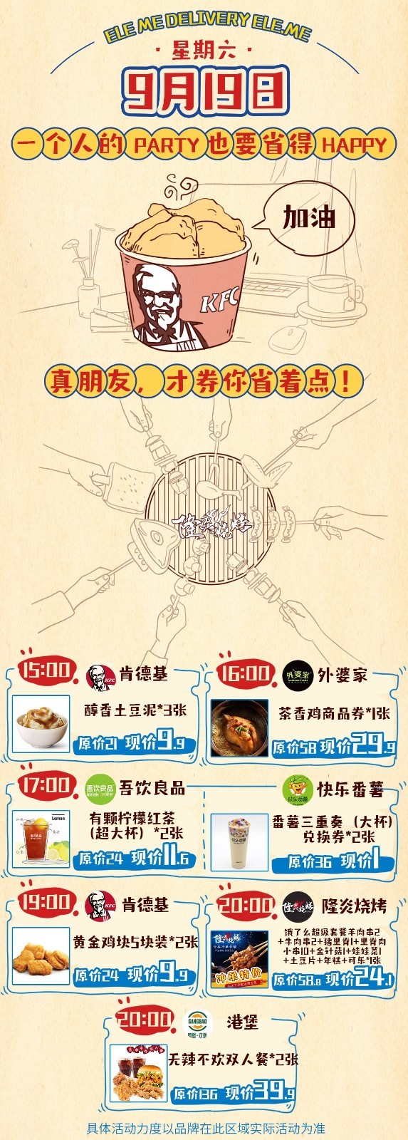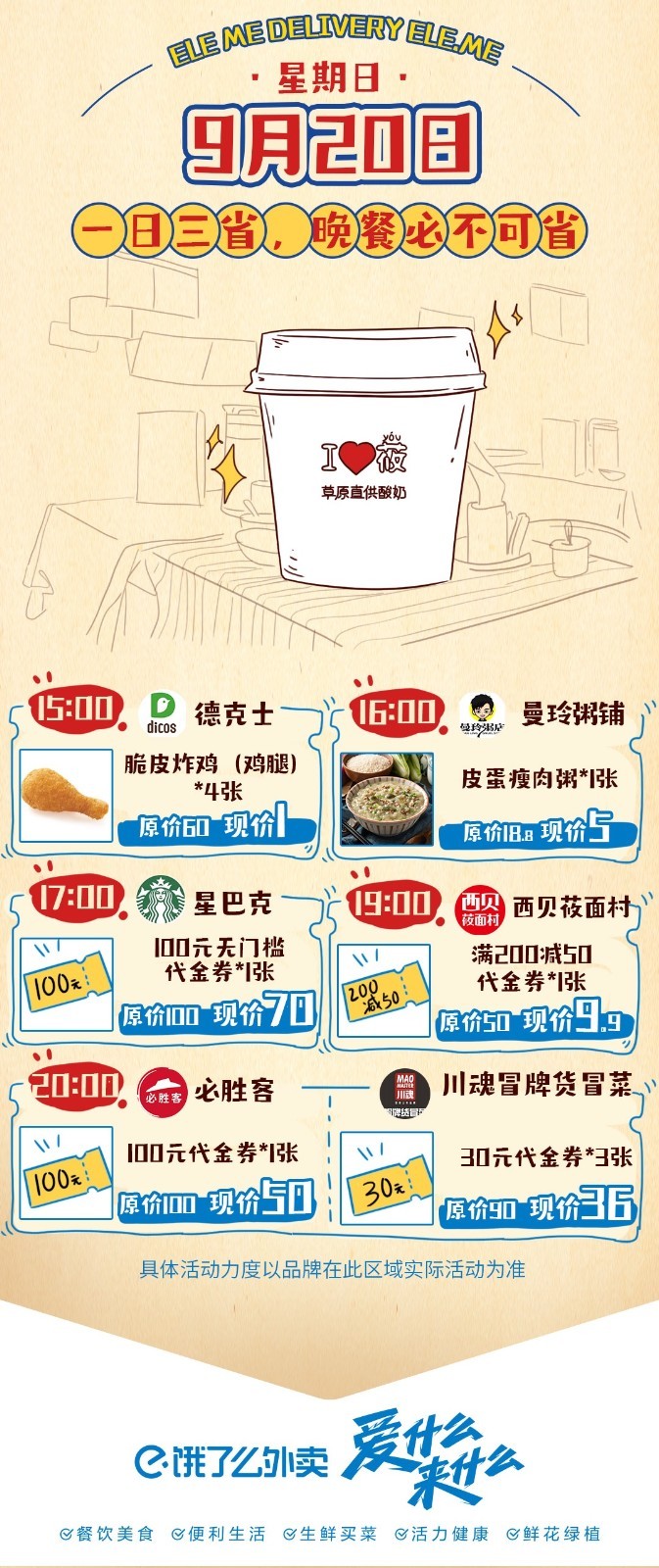 到20日,餓了么外賣平臺推出各種歷史低價,硬核卡券,包括爆款秒殺1元券,如1元搶4只德克士脆皮炸雞;硬核卡券(商品券+代金券+配送券),熱銷商品+高價值商品,優惠力度遠遠大于門店小額代金券;品牌會員卡券:一口價卡券等等。先囤后買,多囤多省,讓你越吃越便宜。另外在9月17日到20日期間,餓了么平臺還將推出萬人團活動,滿足一定門檻即可享受團購價,邀請下單還將獲得額外紅包。