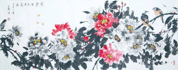 同是一種事物,同是一種環(huán)境,為什么有的人卻沒有獨特的感受,而在孫文啟先生看來,那一瓣一朵,那一枝一葉,都含有情,帶有意呢?這就是一個人的追求,一個人奮斗目標使然。一個以經(jīng)營服飾為職業(yè)的人進商店,逛商場,他的眼里看到的都是服裝的產地,服裝的式樣,服裝的價位,因為他的職業(yè)習慣讓他對服飾有了敏感的觀察力。那么,作為一個畫家也有著自己的職業(yè)習慣。畫山水,要對山水有情意;畫花鳥,要對花鳥有情感。他觀察花鳥也罷,他寫意花鳥也好,都帶著深深的情懷,把花的魂畫出來,把鳥的精神和趣味展示出來。一個人的職業(yè)習慣養(yǎng)成,不過是出于他這個職業(yè)的愛好,而對于一個從事藝術的人來說,首先他應該是有天資的,只是這個天資是他在長期的生活中受到熏陶和感染后更加突出罷了。通過閱讀文章我知道孫文啟先生出生在農村,農村的自然風光陶冶了他,磨煉了他,在走進軍營后,對藝術的愛好和追求,讓他的鄉(xiāng)村生活得到了充分的發(fā)酵,漸漸地,那種純美的清香就會在一定時候得到了釋放。孫文啟的生活釋放就是他長期的素材積累和生活觀察,那就是對大自然的一片真情。于是,在他的筆下,才有如此生動的花鳥,而他畫出的花鳥又是那樣的情趣盎然,感人心魄。