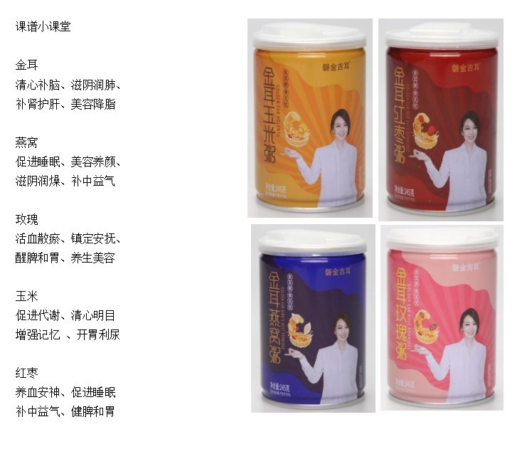 金耳粥系列產品食材普遍性溫、味甘,對身體有極強的溫補效果。有助于快速補充人體所需營養,提高身體代謝。產品經過高溫燉煮工藝,入口絲滑綿軟、氣味芬芳誘人,不斷沖擊你的味蕾。