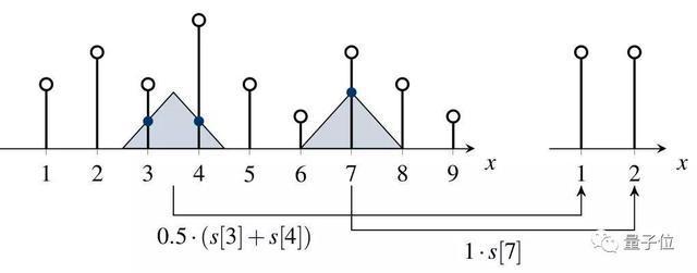 壓縮圖的像素是這樣算出來的:濾波器窗口在圖片源信號 s 上移動,將窗口中的每個像素值(圖中圓圈)乘以該位置窗口上的權(quán)重,得到縮略后的點值。