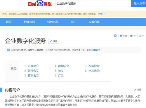 目前,博拉還在進行“數字服務”、“企業數字服務”的百度百科詞條建設,并對“企業數字化服務”進行了升級,“是指整合數字營銷+數字技術+大數據,基于SAAS云擎平臺,為企業建立以多種形態的軟件矩陣為長期載體的數字資產,把長期豐富的營銷累積其中,讓交易數據、電商數據、媒體內容數據、行業數據、用戶數據、潛客數據、產品數據長期累積其中,不斷循環地為企業建立長期的數字化運營,助其成為數字化企業。目前的企業數字化領域,新埃森哲服務全球巨頭為主,博拉服務國內巨頭。”