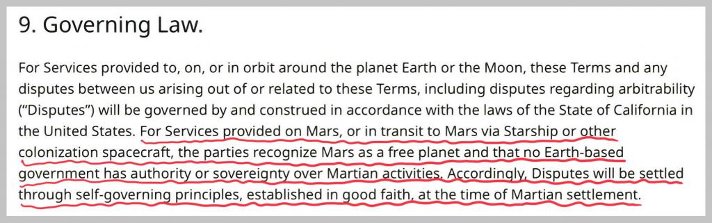后半段谷歌翻譯為:對于在火星上提供的服務,或通過星際飛船或其他殖民化航天器向火星提供的服務,當事方承認火星為自由星球,并且沒有任何地球上的政府對火星活動具有權威或主權。 因此,爭端將通過在火星人解決之時真誠建立的自治原則解決。