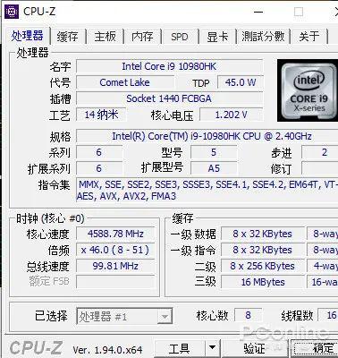 我們從配置表中已經了解到戰斧 700 搭載了全新 intel 第 10 代酷睿 i9-10980HK 處理器,這塊 8 核心 16 線程處理器,主頻為 2.4GHz,通過英特爾 TVB 加速后,睿頻可以高達 5.3GHz。作為十代標壓處理器中唯一完全解鎖倍頻的 CPU,整體性能提升最高可達 44%。可以說 i9-10980HK 是目前游戲本中處理器的最高規格了。