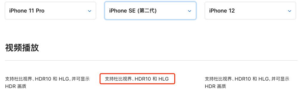 譬如 iPhone SE2,在參數(shù)中「視頻播放」一欄明確寫(xiě)著「支持杜比視界、HDR10 和 HLG」,而隔壁的 iPhone 12 在這基礎(chǔ)上還多了一句:「并可顯示 HDR 畫(huà)質(zhì)」。