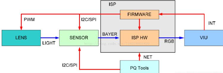 根據專業人士的介紹,ISP 的具體處理流程是這樣:Lens 將光信號投射到 sensor 的感光區域后,sensor 經過光電轉換,將 Bayer 格式的原始圖像送給 ISP,ISP 經過算法處理,輸出 RGB 空間域的圖像給后端的視頻采集單元。在這一過程中,ISP 通過運行在其上的 Firmware 固件對 ISP 邏輯,從而對 Lens 和 sensor 進行相應控制,進而完成自動光圈、自動曝光、自動白平衡等功能。其中,Firmware 的運轉靠視頻采集單元的中斷驅動。PQ Tools 工具通過網口或者串口完成對 ISP 的在線圖像質量調節。