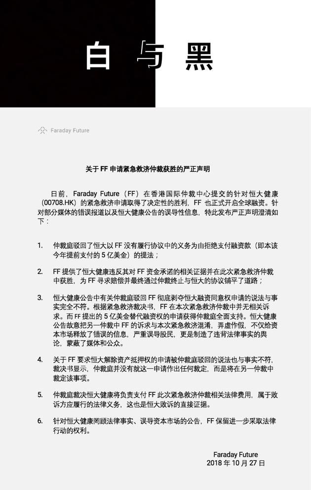 10月27日上午消息,Faraday Future剛剛發布“關于FF申請緊急救濟仲裁獲勝的嚴正聲明”,再次表示Faraday Future(FF)在香港國際仲裁中心提交的針對恒大健康(00708.HK)的緊急救濟申請取得了決定性的勝利,并稱FF也正式開啟全球融資。