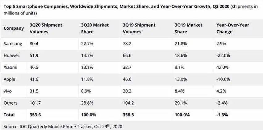 IDC 數據顯示,2020 年第三季度,小米出貨量 4650 萬部,較去年同期增長 42%,市占率超越蘋果達到 13.1%,位列全球前三。而國內排名前五的廠商當中,唯獨小米一家獲得了 13.4% 的正增長,其余四家均出現同比下滑。雷軍激動地連發兩天微博,宣示份額。