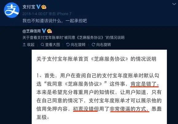 類似的還有前兩年支付寶為年度賬單默認勾選「同意《芝麻服務協議》」致歉,先是表示了「肯定錯了」,之后則表示「初衷沒錯」,只是用了「非常傻逼的方式」。