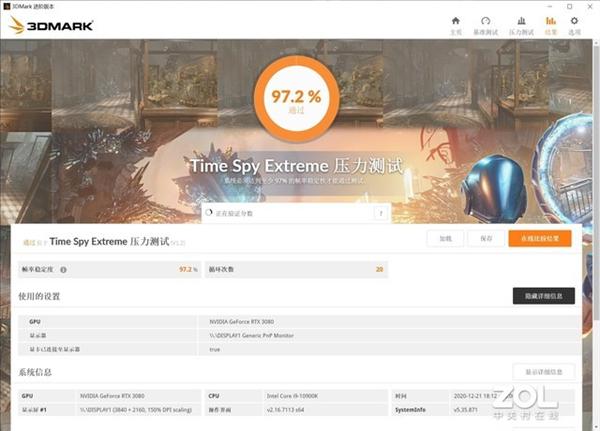 另外我還進行了 Time Spy Extreme 壓力測試,最終得分 97.2%,通過了壓力測試。這說明在測試過程中幀率非常穩定,反映出顯卡散熱設計的實力。